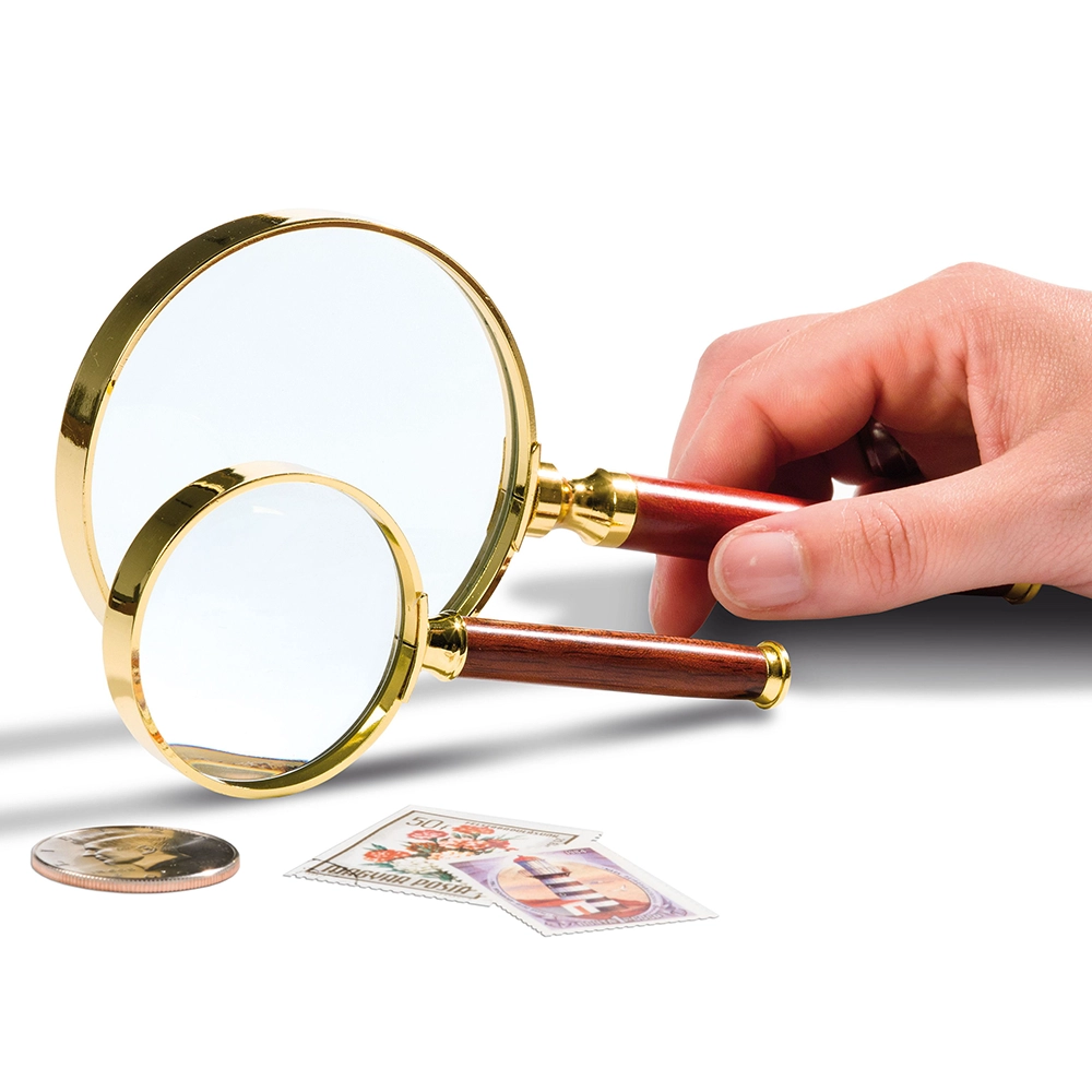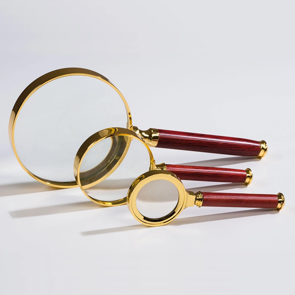 გამადიდებელი ROSEWOOD, მოოქროვილი ჩარჩოთი და წითელი ხის სახელურით. ლინზის დიამეტრი 50 მმ, 3x გადიდებით.