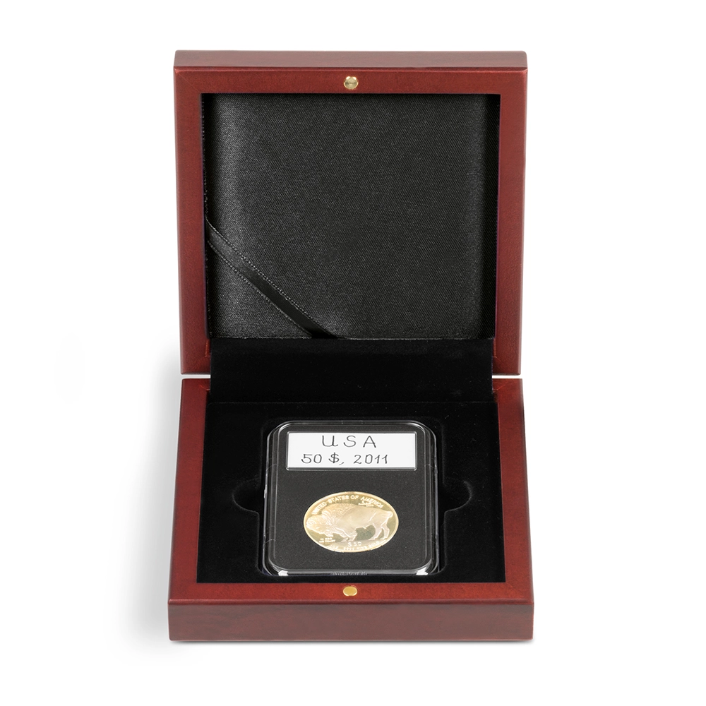 უმაღლესი ხარისხის მონეტის შემნახველი ყუთი წითელის ხის ტექსტურით 1 სერტიფიცირებული მონეტისთვის (“slab”) ან LIGHTHOUSE ჯიბისთვის 60 x 85 მმ ფორმატით როგორებიცაა PCGS, NGC. ფორმირებული ჩასადები, შავი ხავერდოვანი ზედაპირით. საერთო ზომა 120 x 120 x 34 მმ.